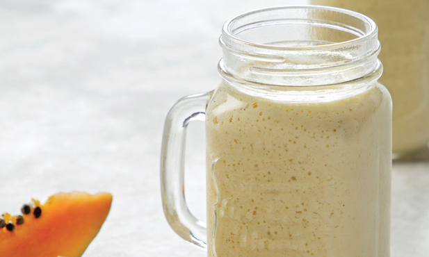 Ao pequeno-almoço ou ao lanche, este batido tropical é nutritivo e saciante. E surpreendentemente fácil de fazer! Decore com folhas frescas de hortelã.