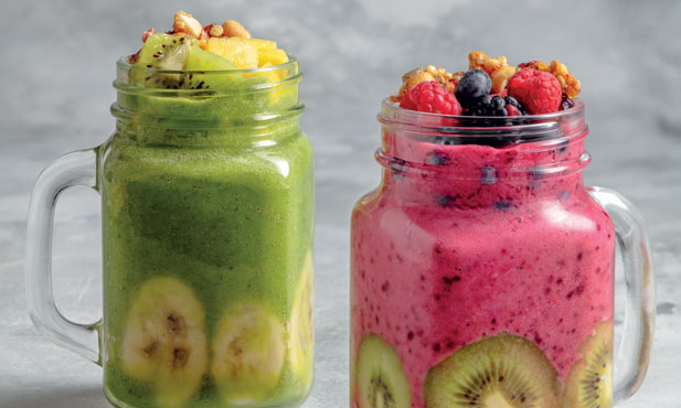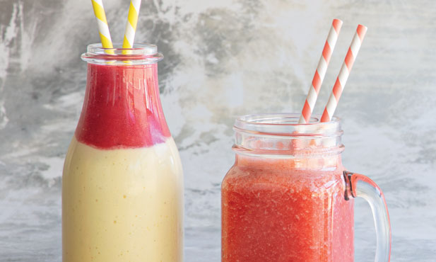 Preparados com fruta e bebida vegetal à base de amêndoa, estes dois batidos de fruta são deliciosos e nutritivos. Para beber logo pela manhã.