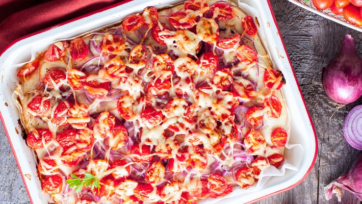 - Decore com o tomate e polvilhe queijo e orégano.